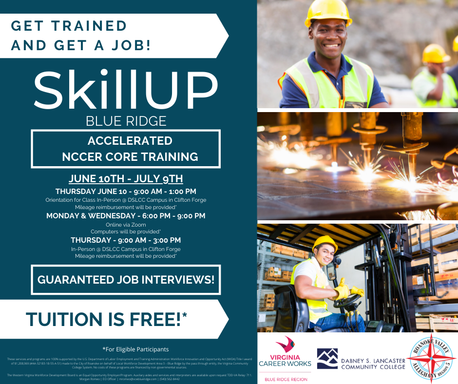Virginia Career Works – Blue Ridge, in partnership with Dabney S. Lancaster Community College (DSLCC) and Roanoke Valley Alleghany Region 5 Adult Education are offering free training for interested individuals to receive their NCCER Core Curriculum Certification! This credential provides all the basic skills you need to enter the construction and/or manufacturing industry and can also be a stepping stone into additional training along these career pathways!